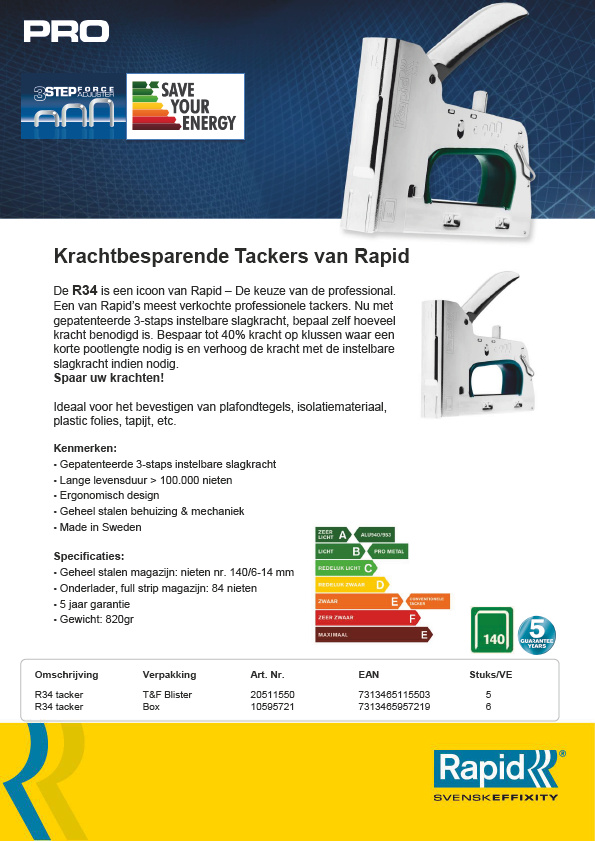 Rapid handtacker - PRO R34 - metaal - voor vlakdraadnieten 6-14 mm - type 140 niet